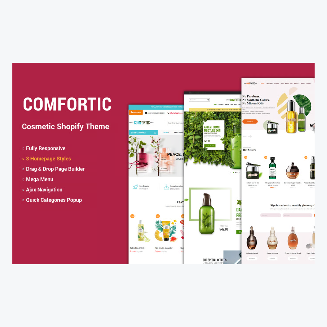 ورغم فخامته، يظل القالب عمليًا وسهل التخصيص. فهو يسمح لأي صاحب متجر أو علامة تجميلية بتعديل الألوان والخطوط والعناصر بسهولة ليعكس أسلوبه الخاص، دون أن يفقد الانسجام العام للتصميم. فـ Comfortic يجمع بين القوة التقنية واللمسة الفنية، في توازن نادر يجعل منه قالبًا مثاليًا لعالم الجمال والعناية بالبشرة.